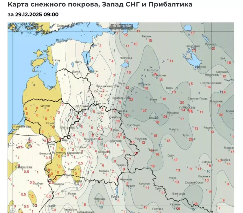 Снежнае покрыва на ўсходзе Беларусі дасягнула вышыні 15 сантыметраў. У Мінску — 8 см.