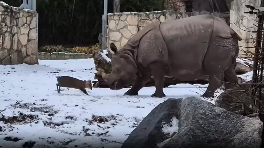 Ва Уроцлаўскім заапарку маленькі алень напаў на вялізнага насарога ВІДЭА