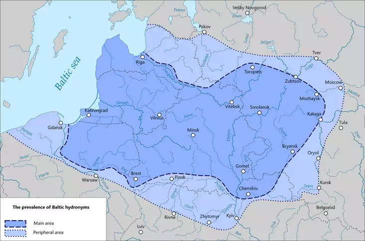 Вучоныя заўважылі падабенства гідронімаў (гэта значыць назваў рэк і азёр) у Літве і на велізарных абшарах Усходняй Еўропы — праз усю Беларусь, Смаленшчыну, Браншчыну, аж да Масквы і нават далей на ўсход. Акадэмікі Уладзімір Тапароў і Алег Трубачоў стварылі ўплывовую тэорыю пра тое, што гэтыя назвы пакінулі продкі сучасных балтаў, якія некалі займалі ўвесь гэты арэал.