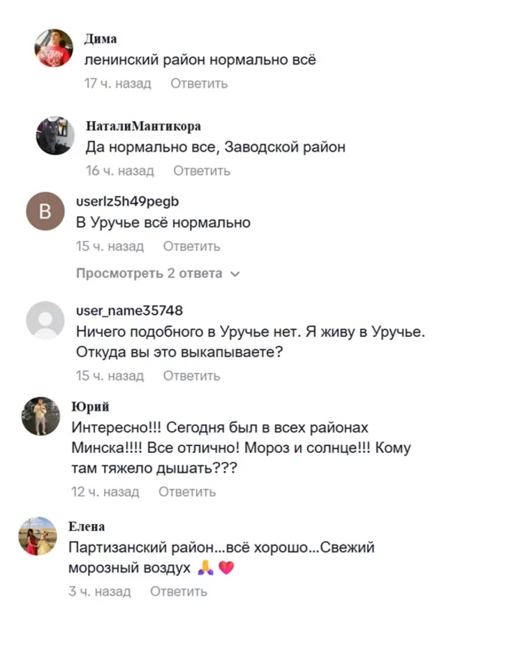 «А мы гуляем ва Уруччы кожны дзень. Атрымліваем асалоду ад зімовай прыгажосці, надвор'я. Падобнага не заўважылі», «Жыву паміж Уруччам і Радыяльнай, гуляю доўга кожны дзень, нічога незвычайнага не заўважыла. Свежае марознае паветра!!!» — пішуць боты і запэўніваюць: «Усё ў нас выдатна, не прыдумляйце».