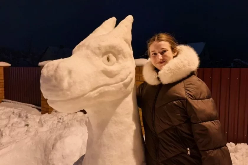 За адны суткі дзяўчына самастойна зляпіла з вялікай гурбы ўражвальную снегавую фігуру цмока. Цяпер скульптура стаіць каля ўвахода ў двор і нібыта «ахоўвае» дом, а мінакі з задавальненнем фатаграфуюцца побач з ёй.