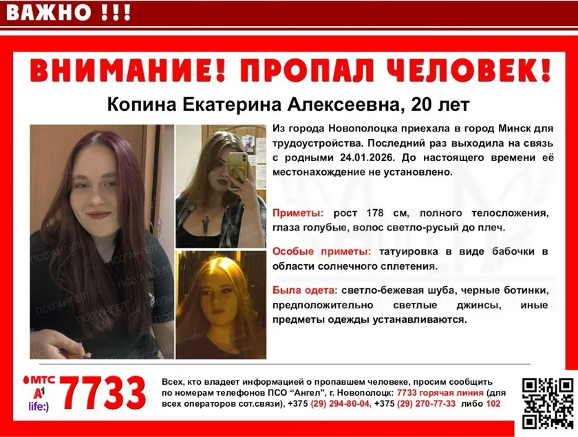У Мінску шукаюць 20‑гадовую Кацярыну Копіну. Дзяўчына прыехала з Наваполацка на працу і знікла. Апошні раз выходзіла на сувязь 24 студзеня 2026 года.