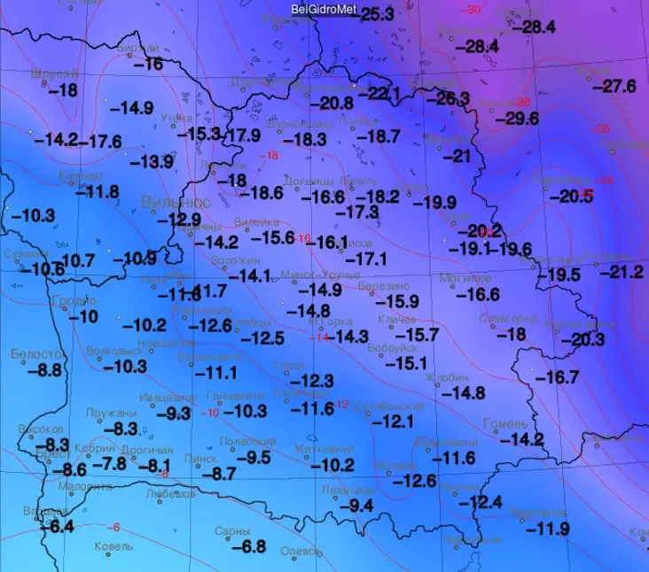 Там было мінус 26,2°С. На поўначы Полачынны было мінус 22,1°С Верхнядзвінску фіксавалася мінус 20,8°С.