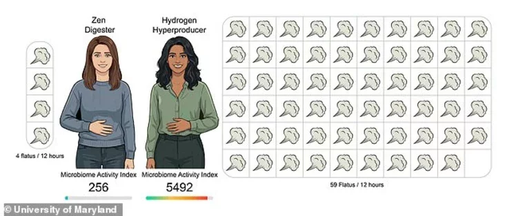 На адным полюсе — так званыя «звышвыпрацоўнікі вадароду» (Hydrogen Hyperproducers). Іх арганізм выпрацоўвае ад 40 да 50 порцый газаў штодня.