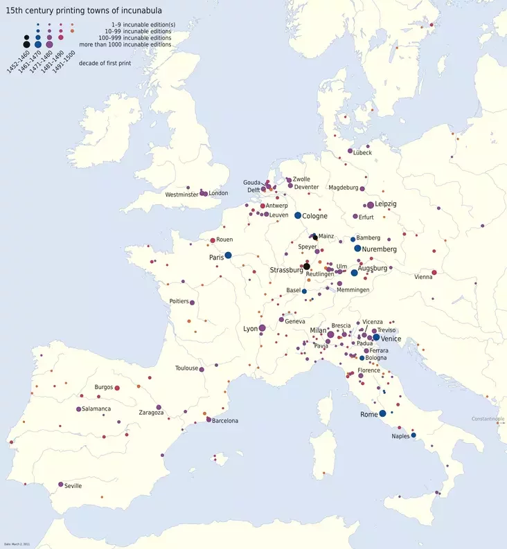 Тэхналогія, якая пачалася з адной-адзінай майстэрні ў Майнцы, распаўсюдзілася па кантыненце з вялізнай для тых часоў хуткасцю. Ужо каля 1480 года друкарні працавалі ў 110 пунктах ва ўсёй Еўропе — ад Германіі, Італіі і Францыі да Іспаніі, Нідэрландаў, Бельгіі, Швейцарыі, Англіі, Багеміі і Польшчы. Да канца XV стагоддзя друкарская справа ахапіла не менш за 271 горад у Цэнтральнай і Заходняй Еўропе. Гэта дазволіла надрукаваць мільёны кніг і закласці асновы масавай камунікацыі.