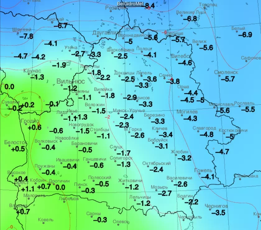 У Мінску было -2,4°С. А ў ваколіцах Брэста і Гродна наогул ўначы быў плюс. У Брэсце +1,1°С. +1,3°С было ў Іўі.