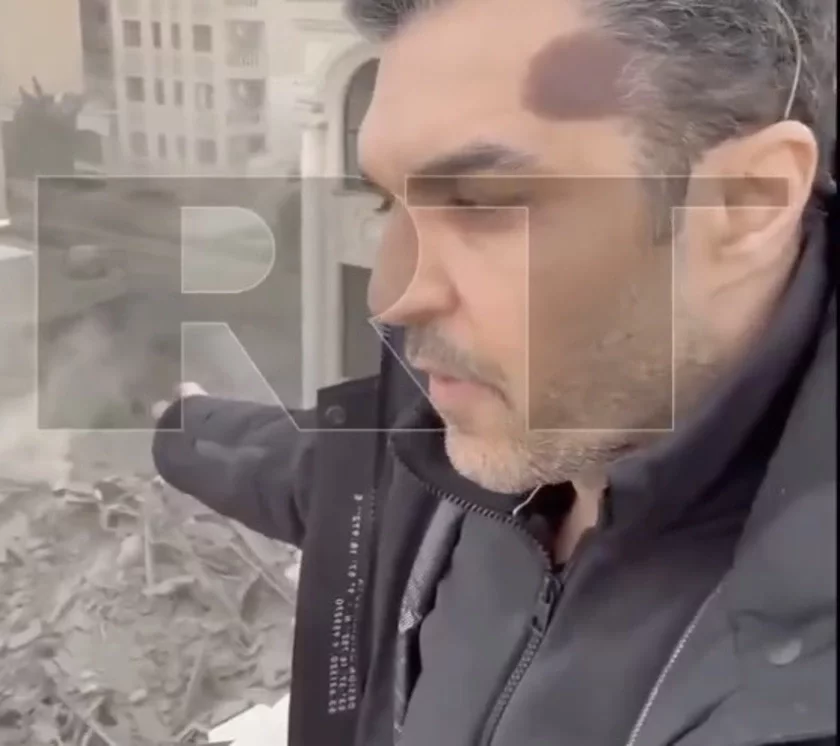 Кіраўнік тэгеранскага офіса RT паказвае на разбурэнні. Скрыншот з відэа