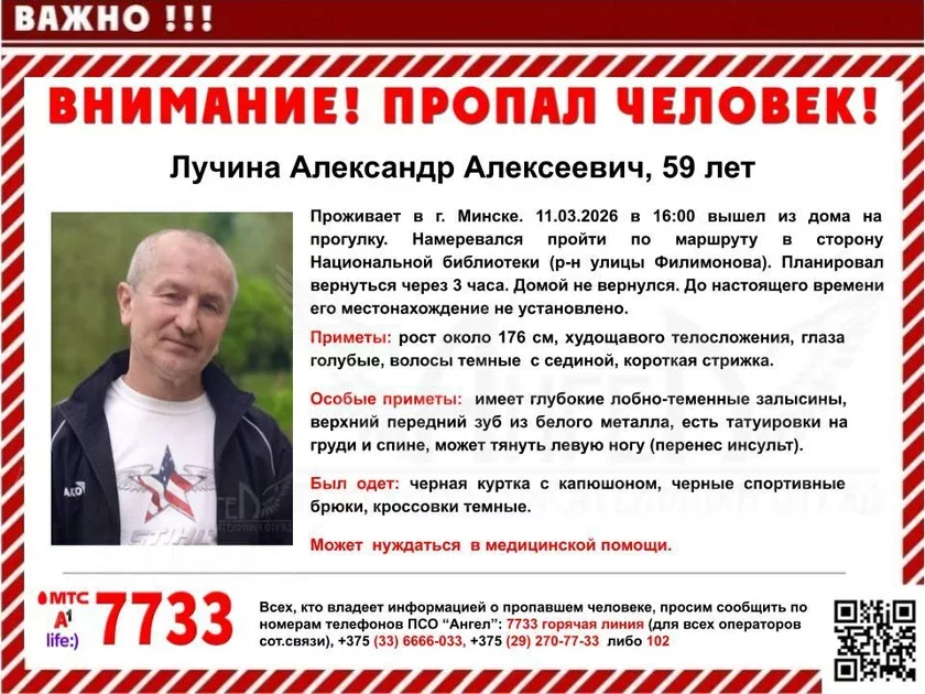 Пошукава-выратавальны атрад «Анёл» паведаміў пра знікненне 11 сакавіка 59‑гадовага Аляксандра Лучыны.