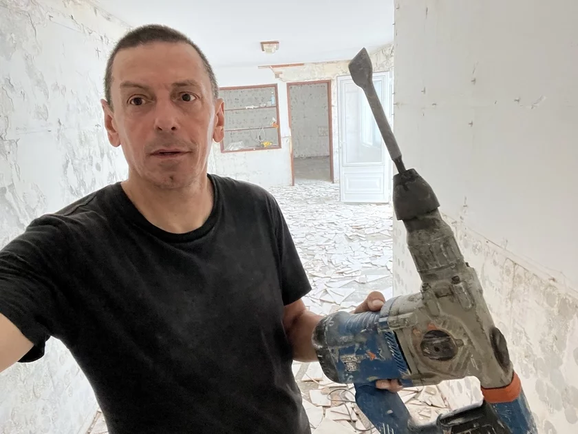 «Амаль месяц спасцігаю азы занятку, які дагэтуль быў аматарствам. Замяшаў і перацягаў тоны цэменту, дэмантаваў кіламетры пліткі і гіпсакартону, раздзяўбаў перфаратарам акамянеласці ўтрамбаваных падлогаў, нарэшце, асвоіў інструмент, пра існаванне якога меў самыя аддаленыя ўяўленні», — піша ён.