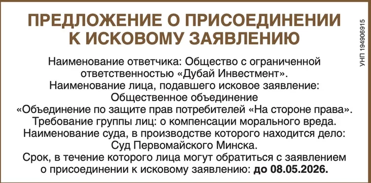 Далучыцца да пазову могуць усе пацярпелыя дольшчыкі і ўласнікі памяшканняў у гэтым комплексе. Для гэтага неабходна падаць заяву ў Суд Першамайскага раёна г. Мінска да 8 мая 2026 года.