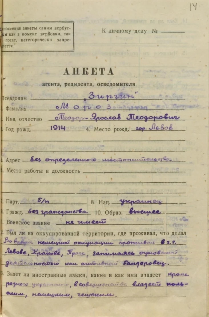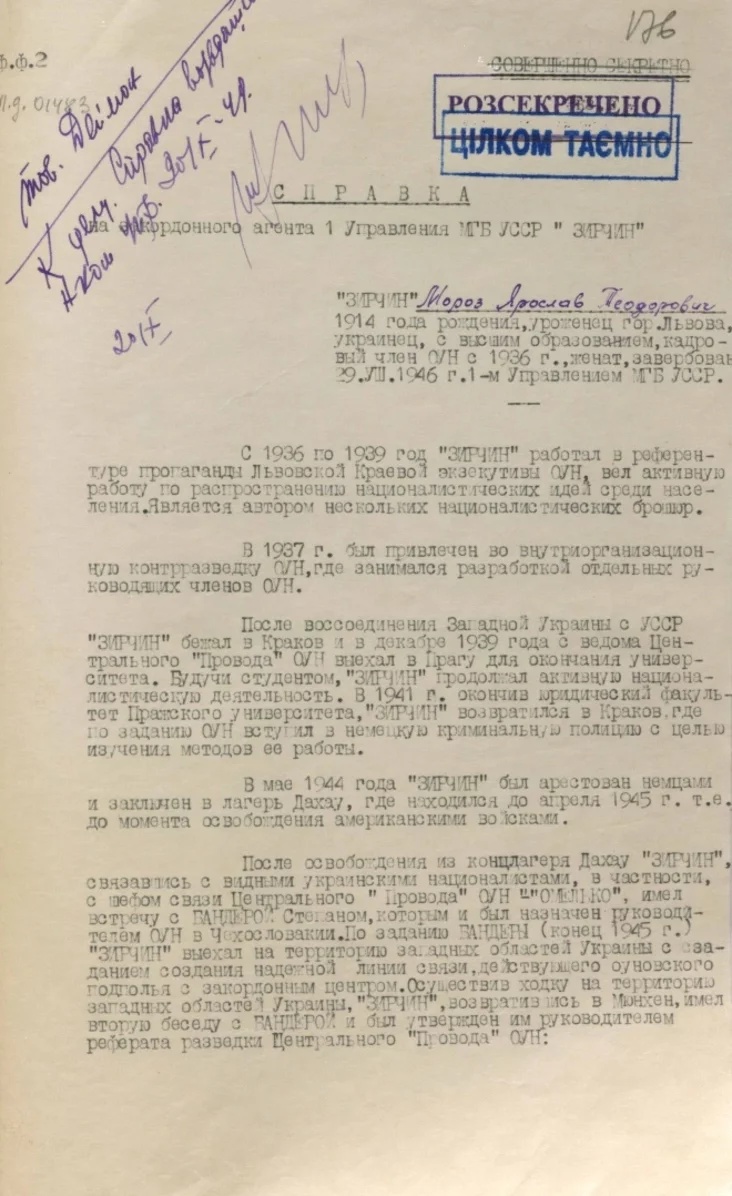 У архіўных фондах Службы замежнай разведкі Украіны захоўваецца шэраг спраў, якія паказваюць, як у розныя гады органы НКВД, МГБ і КГБ СССР спрабавалі пранікнуць у самыя закрытыя структуры ўкраінскай эміграцыі, у тым ліку ў службу бяспекі Замежных частак АУН. Даследчык Аляксандр Скрыпнік на старонках выдання «Історічна правда» знаёміць з адной з такіх гісторый — справай Яраслава Мароза.