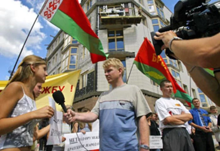 Фота photo.bymedia.net: Ігар Леднік робіць рэпартаж з «афіцыйнай» акцыі пратэсту ля польскай амбасады улетку 2005.