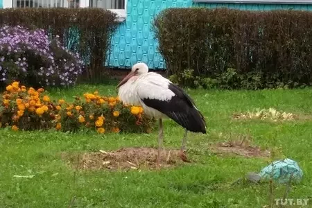 «Стоит и медленно умирает». Под Веткой аист не улетел на юг и живет возле макета птицы на клумбе27