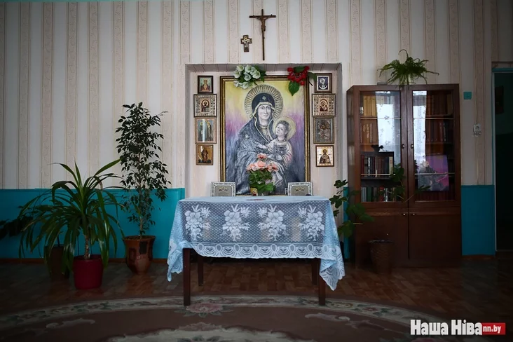 Da taho ž, u kožnym pakoi na ścianie ikona. Ich tut uvohule šmat — visiać i ŭ kalidorach, i navat prosta la niekatorych dźviarej na vulicu. A ŭ pakoi dla adpačynku zroblena niešta nakštałt nievialikaj kaplički — na adnoj sa ścien visiać ikony i pravasłaŭnyja, i katalickija na stale staić raśpiaćcie.