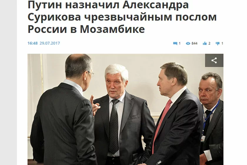 Prezident Rasii pryznačyŭ Alaksandra Surykava nadzvyčajnym i paŭnamocnym pasłom Rasii ŭ Mazambiku. Adpaviedny ŭkaz apublikavany na rasiejskim partale pravavoj infarmacyi.