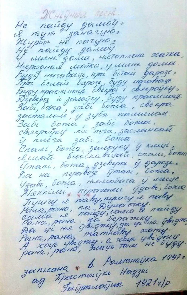 Apošni hod Vožyk pracuje mietadystam pa falkłory ŭ rajonnym centry Sianno Viciebskaj vobłaści, adtul repier sam rodam. Pieśnia hetaja zapisanaja ŭ 1997 hodzie ŭ vioscy Ramanoŭka Sieńnienskaha rajona ŭ Prystaŭki Nadziei Haŭryłaŭny 1921 hoda naradžeńnia. Papierka z zapisam pa-raniejšamu lažyć u Vožyka na pracy.