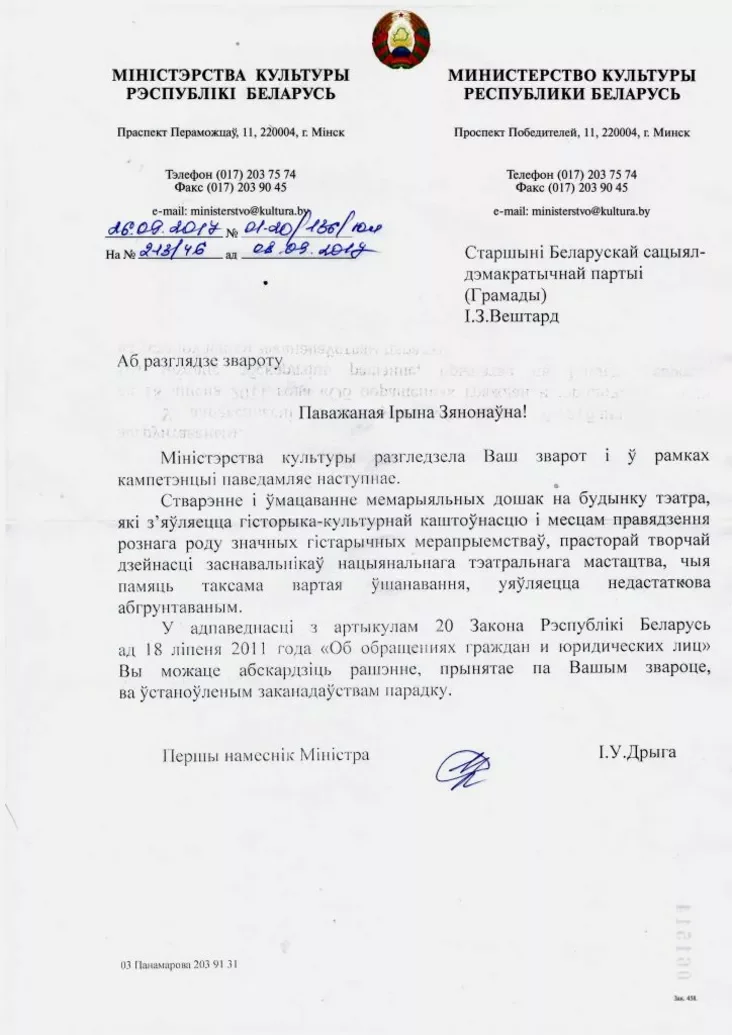 — Haradskija ŭłady maŭčać, a pieršaja namieśnica ministra kultury Iryna Dryha napisała voś taki adkaz: «Stvareńnie i ŭmacavańnie miemaryjalnych došak na budynku teatra, jaki źjaŭlajecca historyka-kulturnaj kaštoŭnaściu i miescam praviadzieńnia roznaha rodu značnych histaryčnych mierapryjemstvaŭ, prastoraj tvorčaj dziejnaści zasnavalnikaŭ nacyjanalnaha teatralnaha mastactva, čyja pamiać taksama vartaja ŭšanavańnia, ujaŭlajecca niedastatkova abhruntavanym».