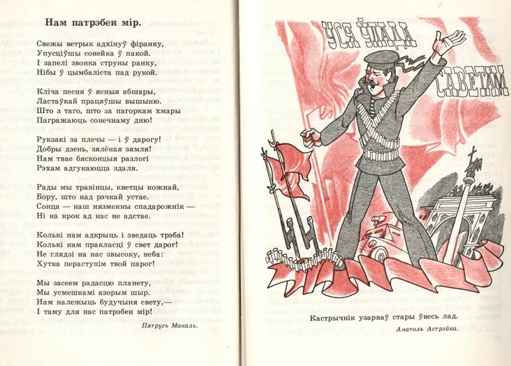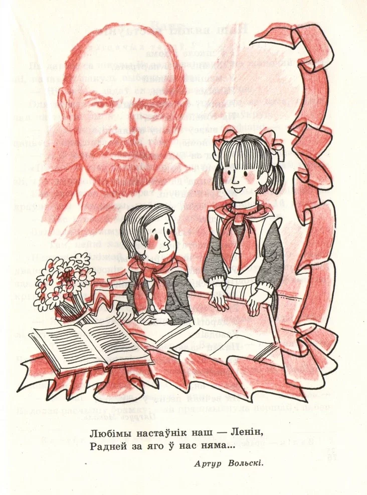 U najlepšych biełaruskich piśmieńnikaŭ adbirali šabłonnyja tvory najpierš na takija temy. Voś vierš, jakim adkryvałasia čytanka: