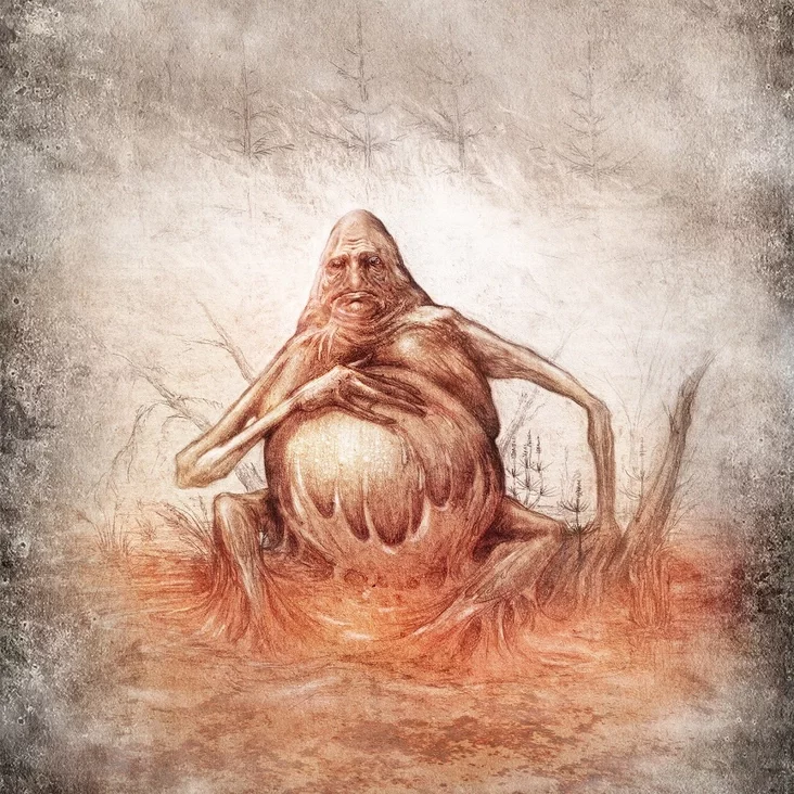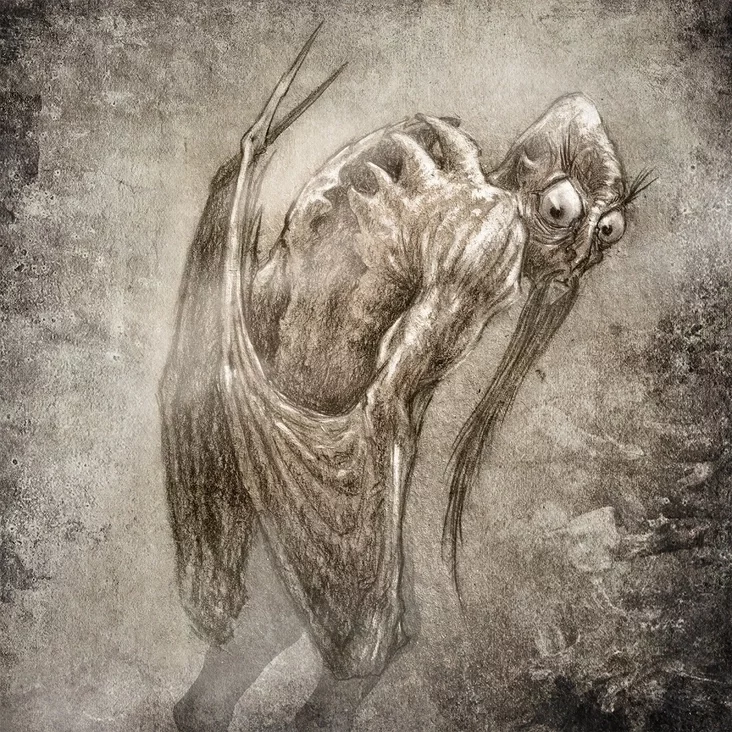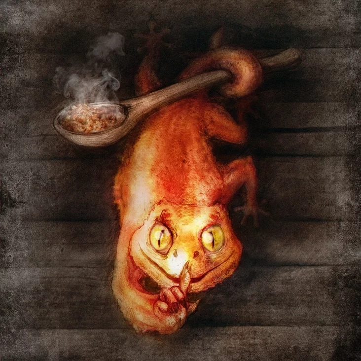 U Słavuka heta znoŭ ža dziadok (kapialuš, łapci, sivyja vusy — usio pry im), jaki hulaje pa ścianie! I mnie znoŭ ža kazali, što pavinna być mienavita tak, bo kanon. A ŭ mianie ŭ dadzienym vypadku ideja była ŭ tym, što istota, jakaja chodzić pa ścienach, vydaje mieładyčnyja huki i maje čyrvanavatuju skuru (jak pratatyp dla paetyčnaha «čyrvonaha župana»), vidavočna padobna da jaščarki ci navat da hiekona.