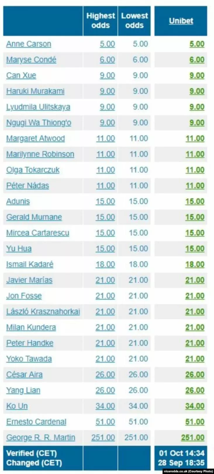 Radyjo «Svaboda» pryvodzić razdrukoŭku bukmiekierskaj kantory NicerOdds sa śpisam najbolš imaviernych kandydataŭ na Nobieleŭskuju premiju pa litaratury.