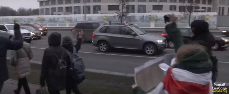 Kałona spyniajecca na skryžavańniach, čakajučy zialonaha śviatła. Kala budynka KDB stajać ludzi ŭ cyvilnym.