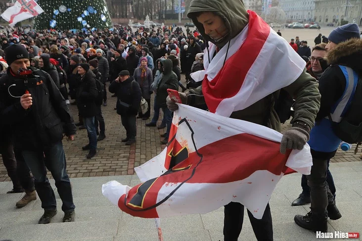Pačałasia patasoŭka. Maksim Viniarski z «Jeŭrapiejskaj Biełarusi» ŭpaŭ z prystupak i padniaŭsia. Pratestoŭcy kryčać «Hańba».