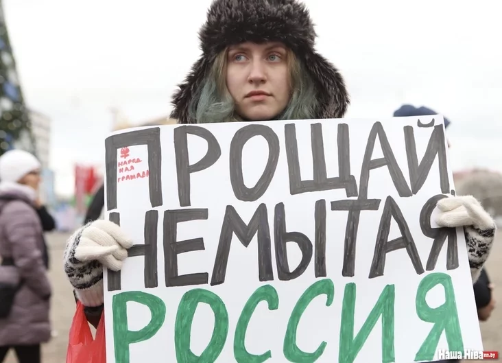 Dziaŭčyna staić z płakatam «Proŝaj, niemytaja Rośsija». «Treba choć niešta zrabić, a nie prosta pisać kamientary, što ničoha nie atrymajecca. Mnie nie ŭsio adno», — kaža jana.