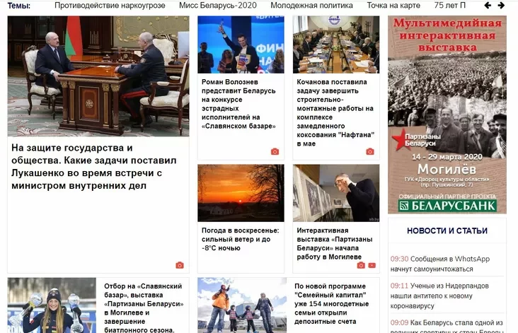 Hałoŭnymi temami na ich zastajucca dziejnaść Alaksandra Łukašenki i top-čynoŭnikaŭ, a taksama adbor udzielnikaŭ na pop-fiestyval «Słavianski bazar» i dapamoha šmatdzietnym siemjam. Pra karanavirus paviedamlajecca, ale jak pra niešta druhasnaje i małavažnaje.