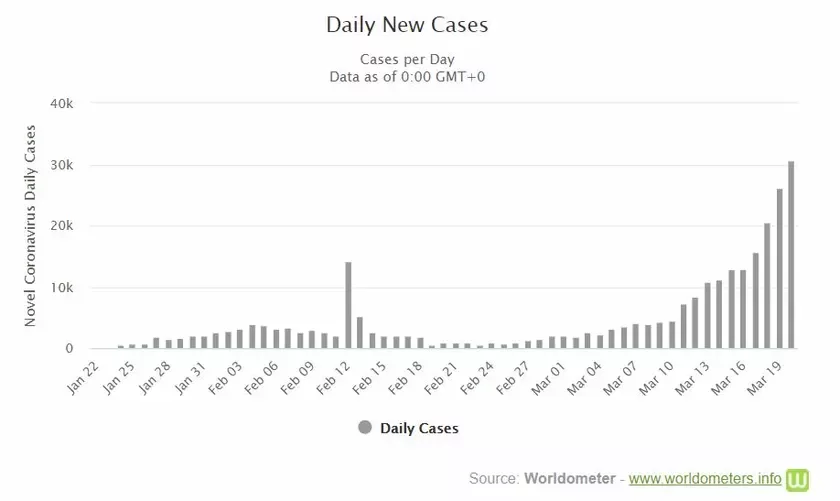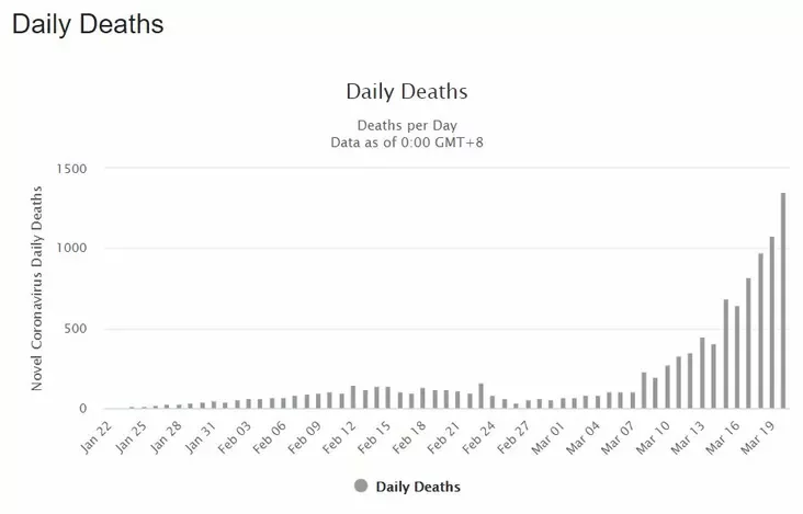 Hladzicie, jak vyhladajuć hrafiki kolkaści zaražeńniaŭ i śmierciaŭ ad karanavirusa ŭ śviecie za dzień pa stanie na kaniec 20 sakavika.