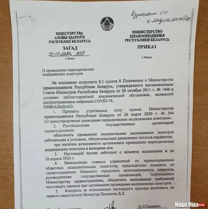 Zahadam pieršaha namieśnika ministra achovy zdaroŭja Biełarusi № 369 ad 31 sakavika byŭ admienieny zahad ministerstva № 344 ad 26 sakavika ab časovym spynieńni praviadzieńnia prafahladaŭ u paliklinikach.