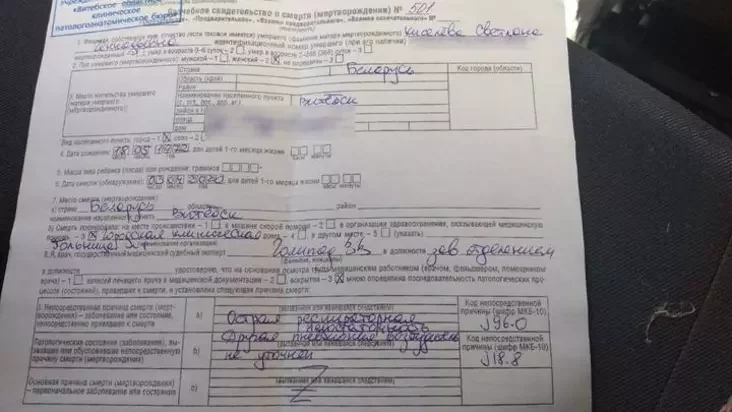 — Tak, u aŭtorak, ale vynikaŭ nam nichto nie paviedamlaŭ. U hrafie «Patałahičnyja stany (zachvorvańni), jakija vyklikali abo jakija abumovili niepasrednuju pryčynu śmierci», napisana: «Nie ŭdakładniena». Lekar nam skazaŭ, heta pra karanavirus.