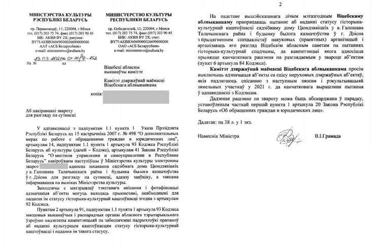 «Prosim vyklučyć adznačanyja abjekty sa śpisu nieruchomych dziaržaŭnych abjektaŭ, jakija padlahajuć śpisańniu z nastupnym znosam i rekultyvacyjaj ziamielnych učastkaŭ u 2021 hodzie da kančatkovaha vyrašeńnia pytańnia», — havorycca ŭ liście za podpisam namieśnika ministra kultury Valeryja Hramady.