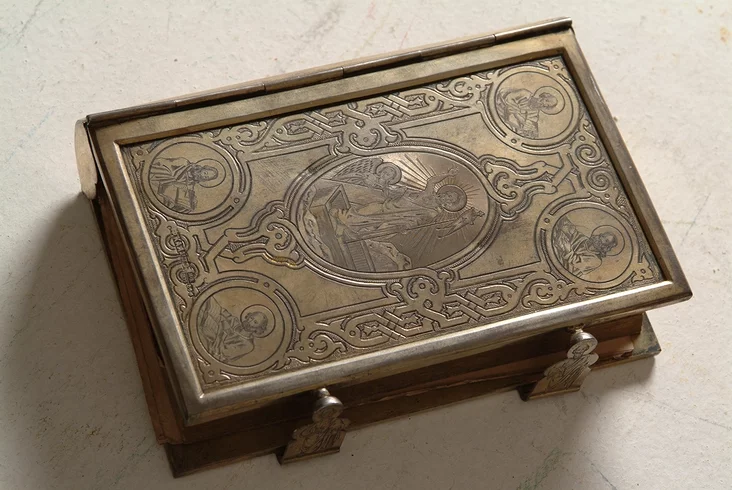 Skradzieny srebny akład Jevanhiella moh vyhladać tak, jak hety, z kalekcyi Nacyjanalnaj biblijateki. Pa kutkach vyjavy čatyroch jevanhielistaŭ, u centry — scena ŭvaskrašeńnia Chrysta. A źviarnicie ŭvahu na zašpiłki: majstar zrabiŭ ich u vyhladzie apostałaŭ Piatra i Paŭła