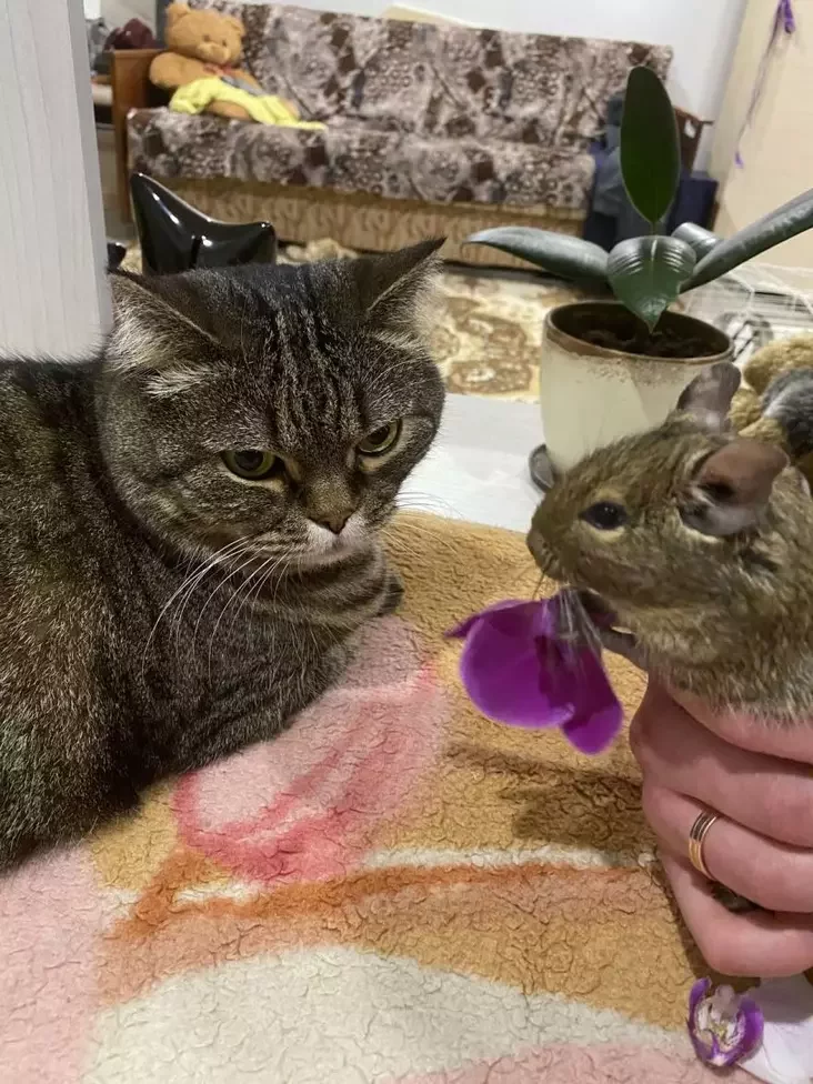 Pastupova Lena i Ženia pryvučali jaho da novaha hadavanca: pakazvali vaviorku na dałoni, davali paniuchać jaje, sadzili źvierchu na kata. A vaviorku ŭ svaju čarhu adaptavali da kvatery: spačatku vypuskali pabiehać pa stale, puskali na kuchniu, potym pa ŭsioj kvatery.
