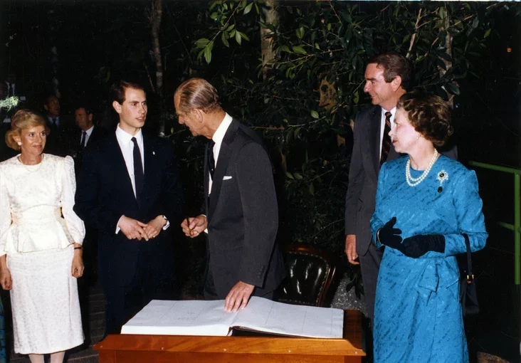 Karaleva Lizavieta i prync Edvard padpisvajuć knihu dla haściej na vystavie World Expo 88 u aŭstralijskim Bryśbienie, 1988 hod. Fota: flickr.com