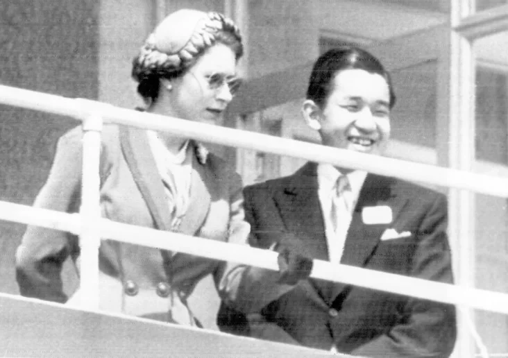 Karaleva razam ź japonskim pryncam Akichita, 6 červienia 1953 hoda. U 1989 hodzie Akichita staŭ impierataram i praz 20 hadoŭ adroksia ad trona. Jon staŭ pieršym manarcham u sučasnaj historyi Japonii, jaki pakinuŭ svaju pasadu biez vajny. Fota: AR