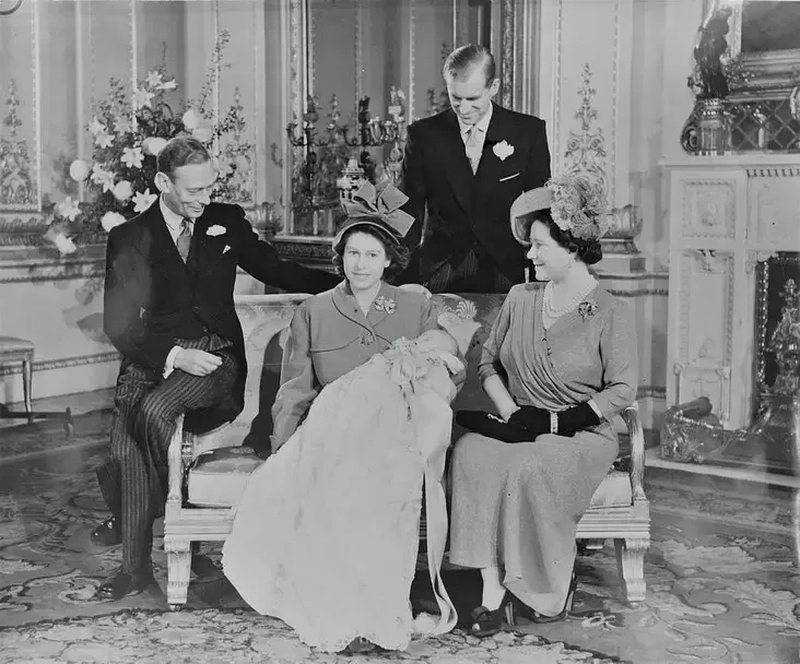 Siamiejny partret u honar chreśbin prynca Čarlza. Źleva tahačasny karol Brytanii Hieorh VI, na kanapie — karaleva Lizavieta (sprava) i ich dačka pryncesa Lizavieta (budučaja karaleva Lizavieta), na jaje rukach — prync Čarlz. Za imi — muž pryncesy Filip, hiercah Edynburhski. 1948 hod. Fota: UK Government artistic works