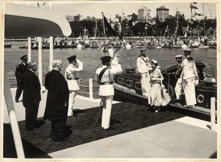 Lizavieta II prybyvaje na karaleŭskaj baržy ŭ zaliŭ Port-Džeksan, Sidnej, 1954 hod. Fota: picryl.com