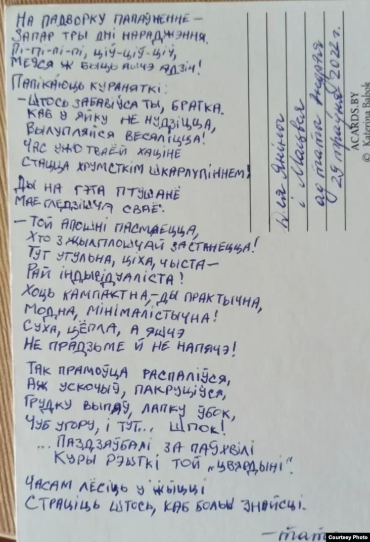 U turmie Andrej pačaŭ składać dziciačyja vieršy. Žonka Alesia dasyłaje jamu čystyja paštoŭki z zabaŭnymi malunkami, a na ich Andrej u adkaz piša Janinie i Maćvieju pavučalnyja vieršyki.