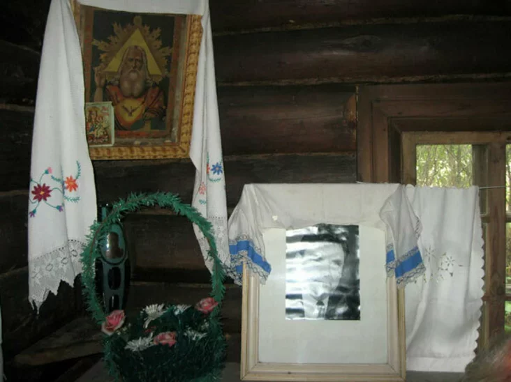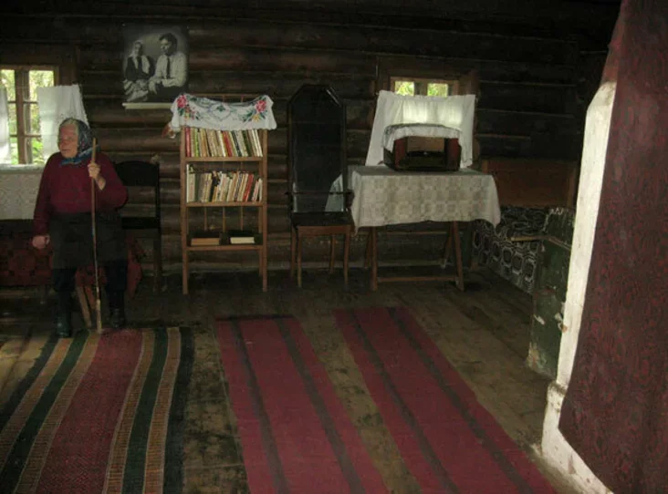Pryziemisty budynak, niahledziačy na hady, nie padajecca sparachniełym: ścieny z sasnovaha kruhlaka ź nievyvodnym ciomnym nalotam ad łučyny, taŭščeznyja belki. Ciomnyja siency. Nad uvachodam prasiečana akienca-bajnica — najpierš dla śviatła, ale i sa strelby možna praź jaho palnuć. Źleva dźviery ŭ adziny pakoj, sprava — u varyŭniu. U pakoi, u čyrvonym kucie — staražytnaja ikona: baradaty Boh-Baćka. Tank zhadvaŭ jaje svaich «Listkach kalendara», paraŭnoŭvajučy vyjavu ź dziedam Chviedaram. Ikonu pryniesła ŭ pasah maci paeta, Domna Ivanaŭna. Pad ikonaj na pokuci staić partret Maksima Tanka.