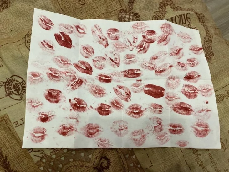 Ała raspaviadaje, što abiacała na sustreču nafarbavać vusny čyrvonaj pamadaj. «Pazaŭčora, jašče kali jon byŭ žyvy, ja zrabiła heta, kab ukłaści jamu ŭ navahodni list ad ruki. Ciapier pakładu ŭ mahiłu pierad kremacyjaj. Dumaju, jamu spadabajecca», — apisvaje list, zapoŭnieny adbitkami vusnaŭ u čyrvonaj pamadzie.