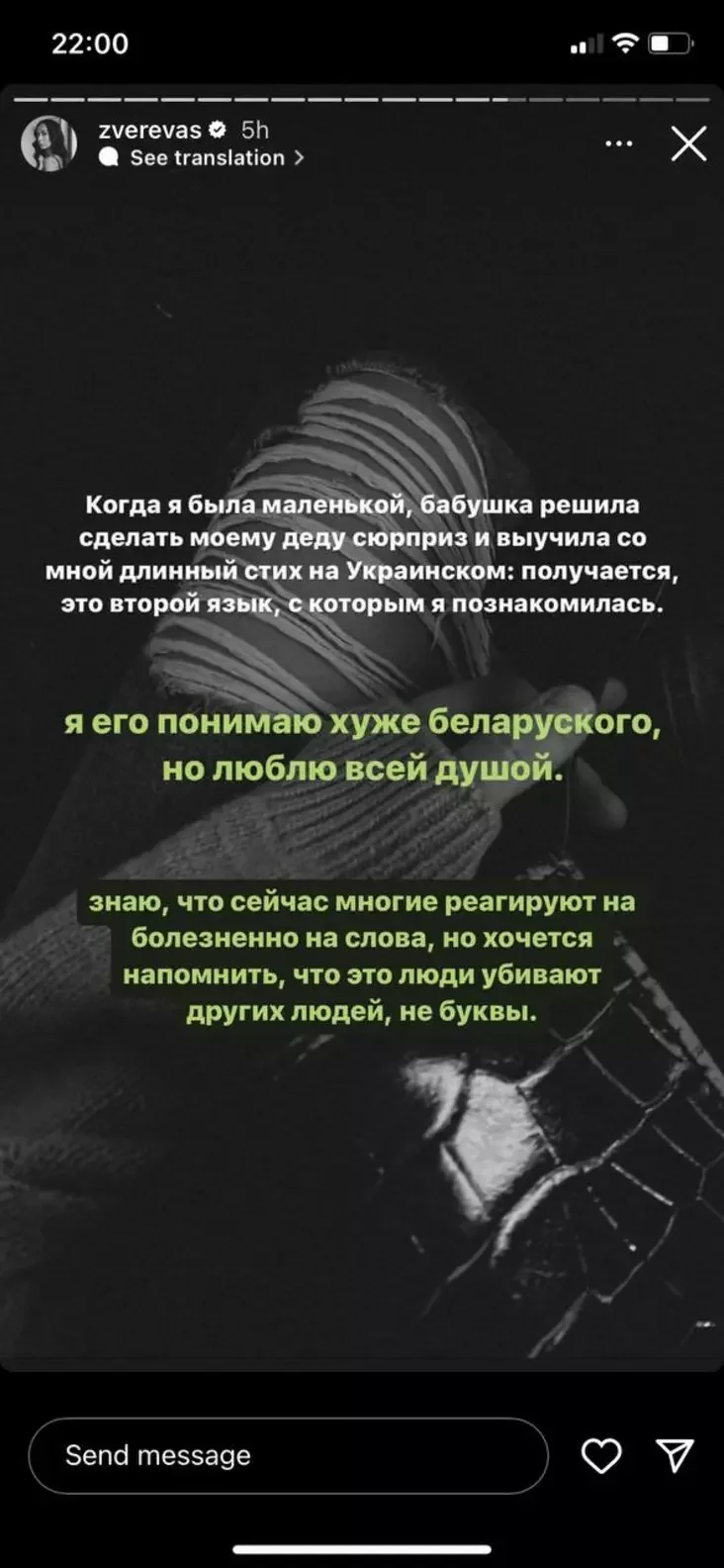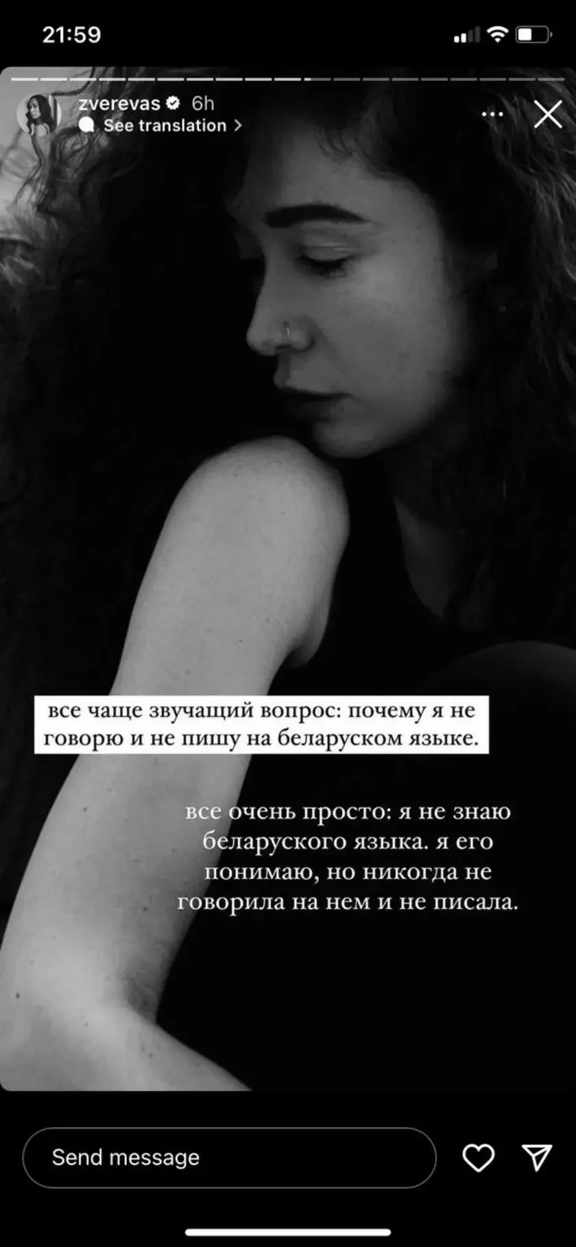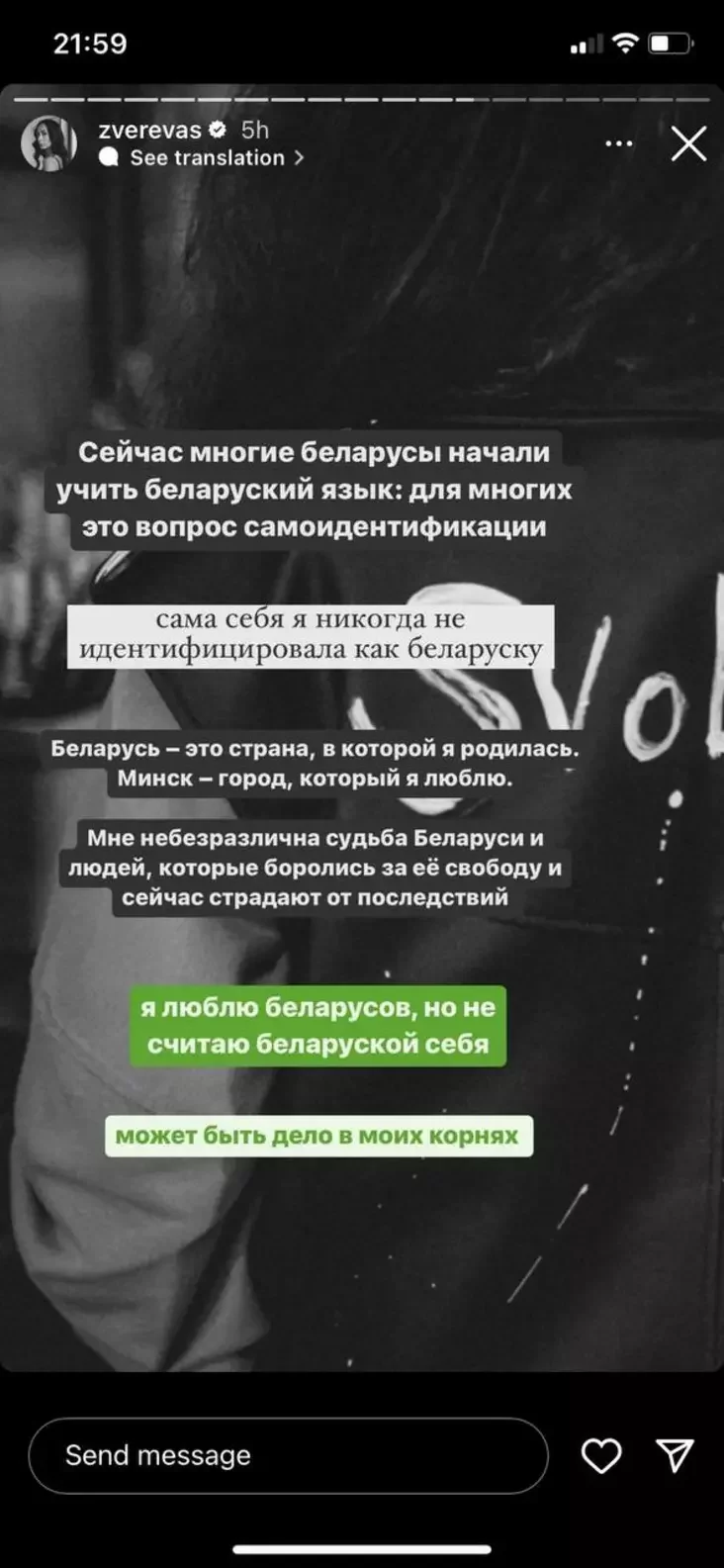 «Biełaruś — heta kraina, u jakoj ja naradziłasia. Minsk — horad, jaki ja lublu. Mnie nieabyjakavy los Biełarusi i ludziej, jakija zmahalisia za jaje svabodu i ciapier cierpiać ad nastupstvaŭ. Ja lublu biełarusaŭ, ale nie liču biełaruskaj siabie. Mahčyma, reč u maich karaniach», — napisała błohierka.
