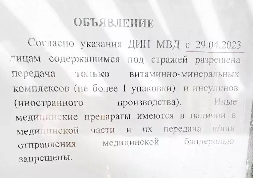 Ciapier stała viadoma, što, pavodle ŭkazańnia Departamienta vykanańnia pakarańniaŭ ad 29 krasavika, viaźniam, jakija ŭtrymlivajucca pad vartaj, dazvolena pieradavać tolki vitaminna-minieralnyja kompleksy (nie bolš za adnu ŭpakoŭku) i insulin zamiežnaj vytvorčaści. Inšyja miedykamienty nibyta jość u najaŭnaści ŭ miedyčnych častkach izalataraŭ, tamu pieradavać ich ci adpraŭlać banderollu zabaroniena.
