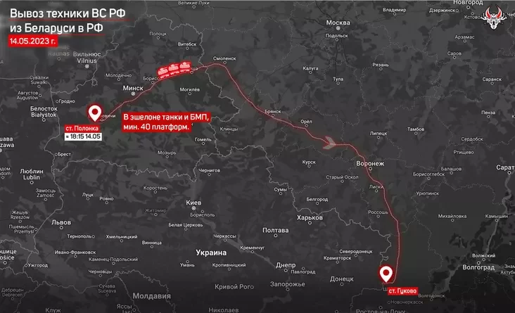 14 maja ešałon z rasijskaj vajskovaj technikaj adpraviŭsia ź Biełarusi ŭ kirunku Łuhanskaj vobłaści, paviedamiła manitorynhavaja hrupa «Biełaruski Hajun».
