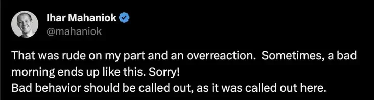 Paśla taho, jak post Hery staŭ virusnym, na Machańka zvaliłasia davoli šmat nianaviści, a jon napisaŭ vybačalny post. «Z majho boku heta było hruba i zanadta. Čas ad času kiepskaja ranica zakančvajecca voś tak. Prabačcie! Na drennyja pavodziny varta źviartać uvahu, akurat tak i adbyłosia», — napisaŭ Ihar.
