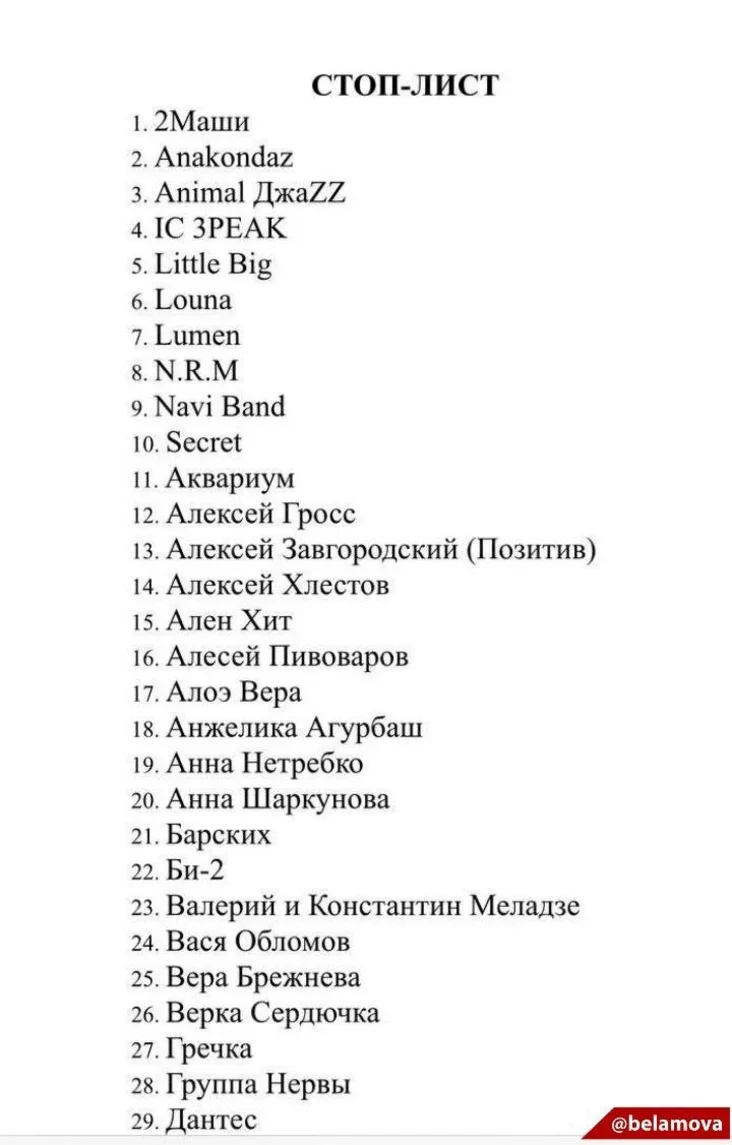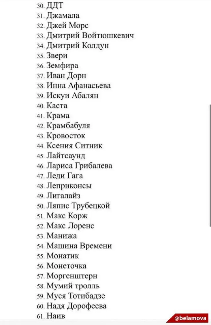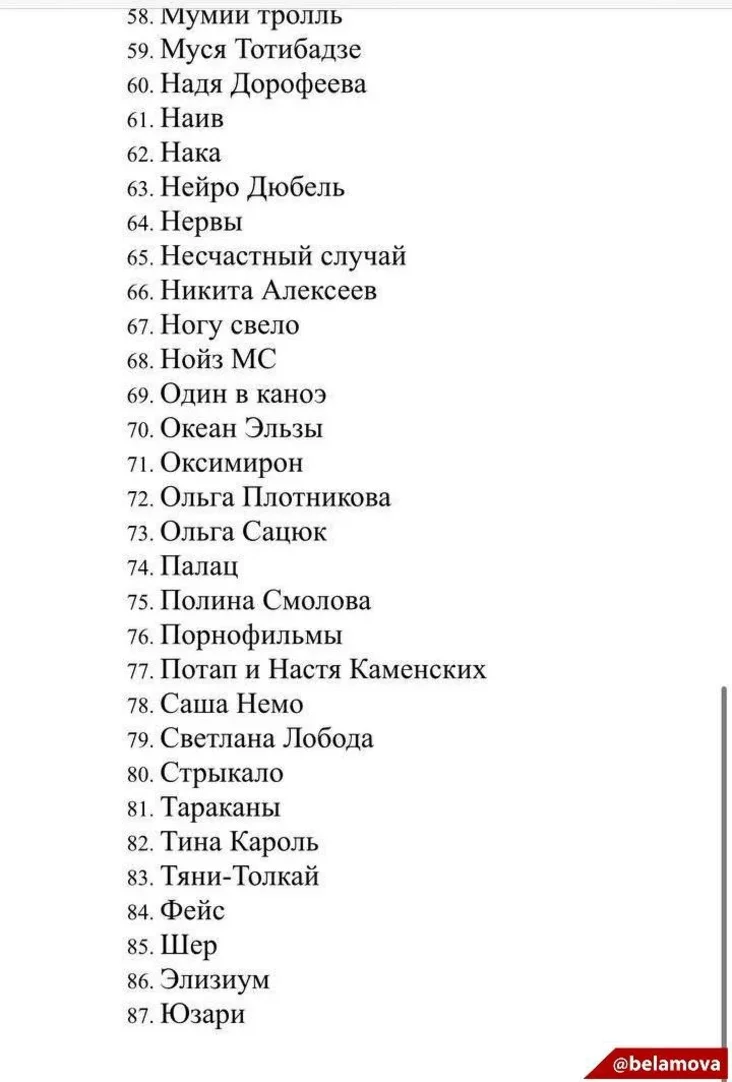 U śpisie 87 artystaŭ i hurtoŭ. Raniej stała viadoma, što mienavita taki čorny śpis byŭ zaćvierdžany Minkultam. Ciapier jaho davodziać navat da siarednich navučalnych ustanoŭ.