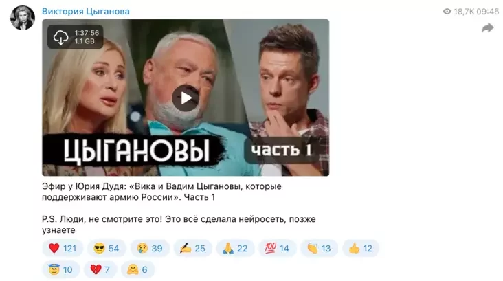 «Efir u Juryja Dudzia: «Vika i Vadzim Cyhanovy, jakija padtrymlivajuć vojska Rasii». Častka 1. P.S. Ludzi, nie hladzicie heta! Heta ŭsio zroblena niejrasietkaj, paźniej daviedajeciesia», — zajaviła Cyhanova.
