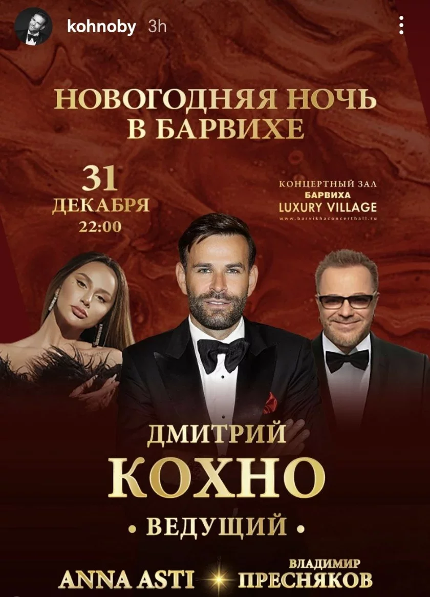 Papularny biełaruski viadoŭca Dźmitryj Kachno paviedamiŭ u instahramie, što budzie vieści navahodniuju noč u Barvisie — elitnym pasiołku ŭ Padmaskoŭi. Siarod artystaŭ, jakija vystupiać tam, zajaŭleny Uładzimir Praśniakoŭ — jon nie tolki adkryta apraŭdvaje vajennuju ahresiju, ale i pieraličvaje častku svaich prybytkaŭ ad kancertaŭ na padtrymku vajny.