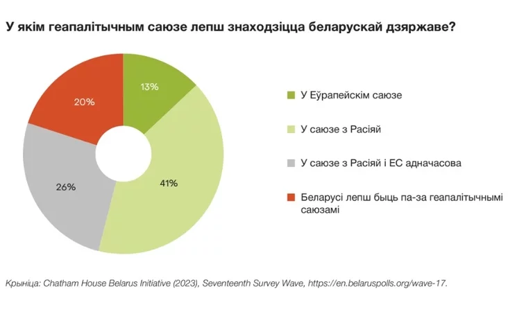 Jak adznačaje aŭtar, siarod biełarusaŭ niama značnych antyzachodnich nastrojaŭ. Za skaračeńnie suviaziaŭ i addalenaść ad krainaŭ Zachadu vykazałasia tolki 13% apytanych. A voś za praces zbližeńnia — 64%.