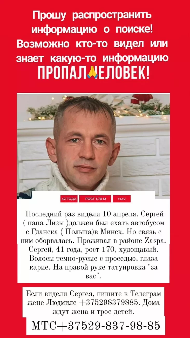 Tydzień tamu ŭ Polščy źnik mazyrčuk Siarhiej Cierabaviec. Heta tata dziaŭčynki Lizy, jakoj nie tak daŭno biełarusy sabrali 1,8 miljona dalaraŭ na samyja darahija leki ŭ śviecie. «Naša Niva» vyśvietliła ŭ znajomych siamji niekatoryja padrabiaznaści hetaj historyi.